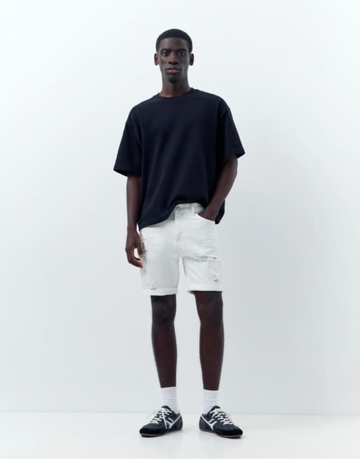 Pull&Bear Ripped denim bermuda shorts in off white