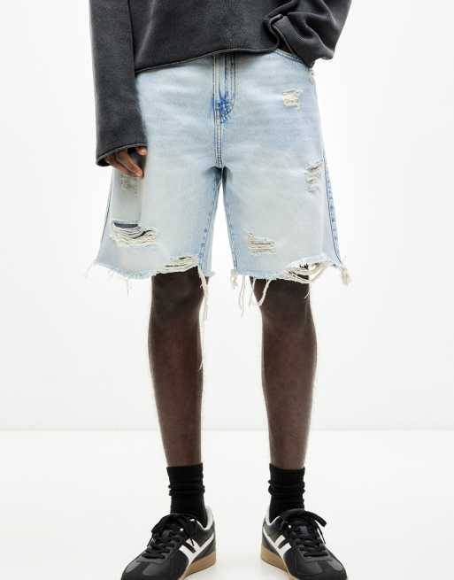 Pull&Bear Ripped straight fit denim bermuda shorts in pale indigo