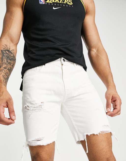 Pull&Bear straight fit denim shorts with rips in white