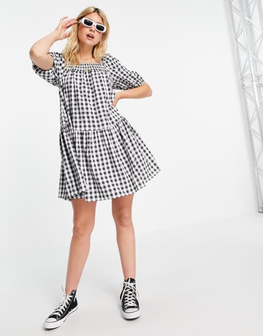 QED London square neck mini smock dress in black gingham