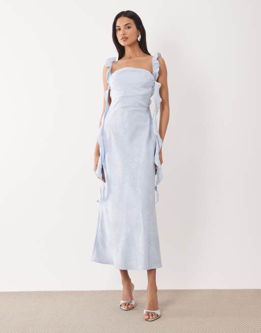 Rare London ruched drape detail lace trim floral jacquard satin in light blue