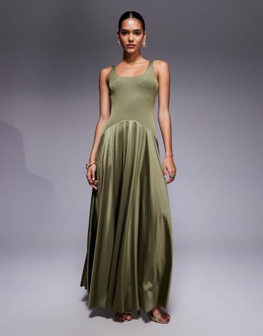 Rare London satin scoop neck dropped waist maxi dress in olive