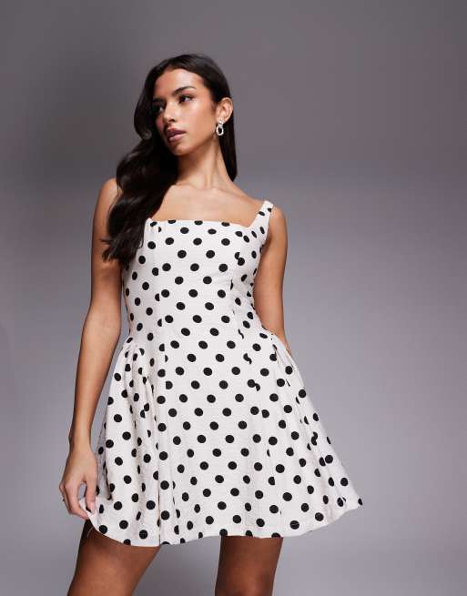 Rare London square neck lace up back detail side pleat mini dress in white polka dot