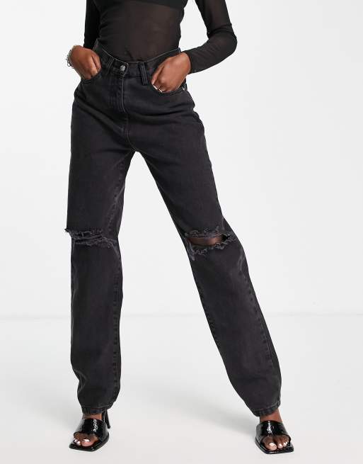 Rebellious Fashion denim distressed knee extra long jeans in charcoal
