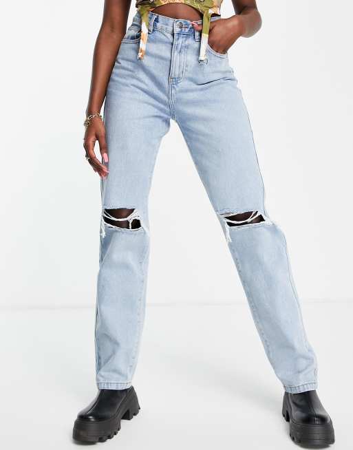 Rebellious Fashion denim distressed knee extra long jeans in mid wash