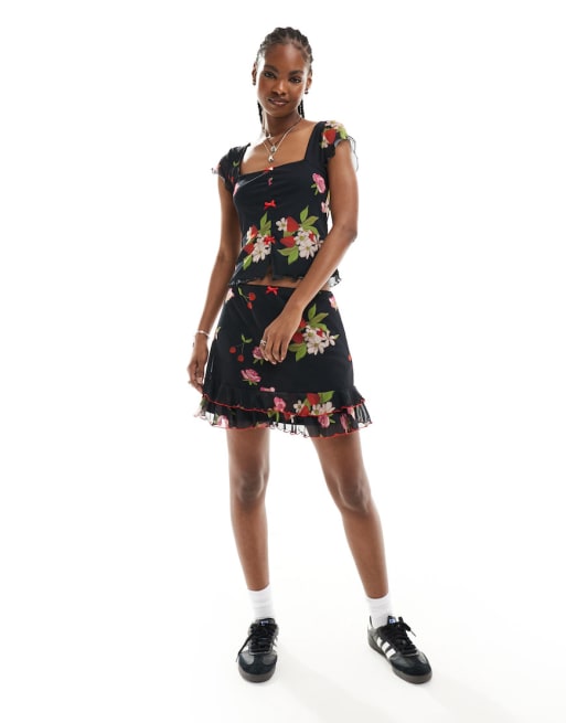 Reclaimed Vintage puff sleeve baby doll top and mini skirt with bows co-ord in b