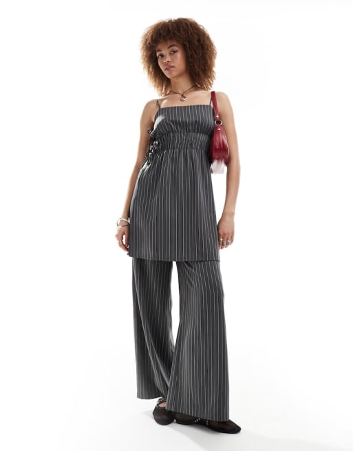 Reclaimed Vintage tunic top with tie sides and wide leg trouser in pinstripe co-