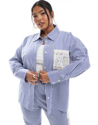 Renee Studio Plus exclusive button through tie back crochet detail shirt co-ord in blue and white stripe