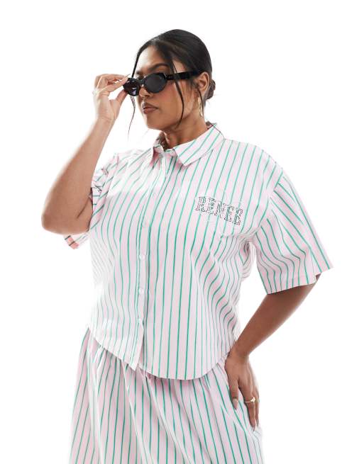 Renee Studio Plus exclusive cropped button down shirt co-ord in pink and green stripe