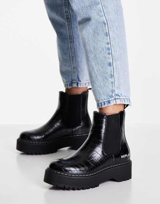 Replay croc detail chunky chelsea boots in black