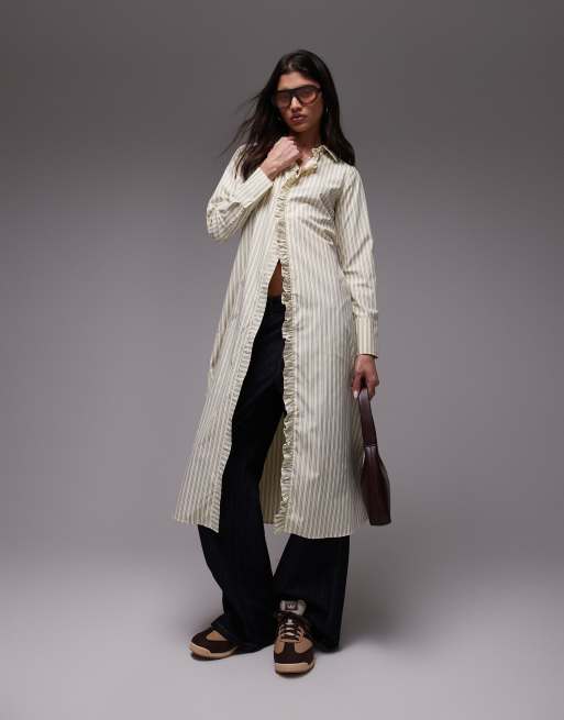 Resume fitted midaxi shirt dress with ruffle placket in multi creme stripe