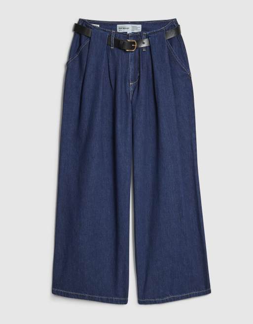 River Island Petite Petite belted pleated wide leg jeans in denim - dark