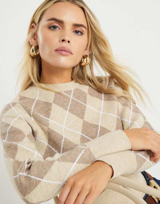 River Island Petite Petite knitted long sleeve argyle top in beige - light