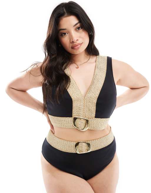 River Island Plus bikini top with buckle detail in gold and black