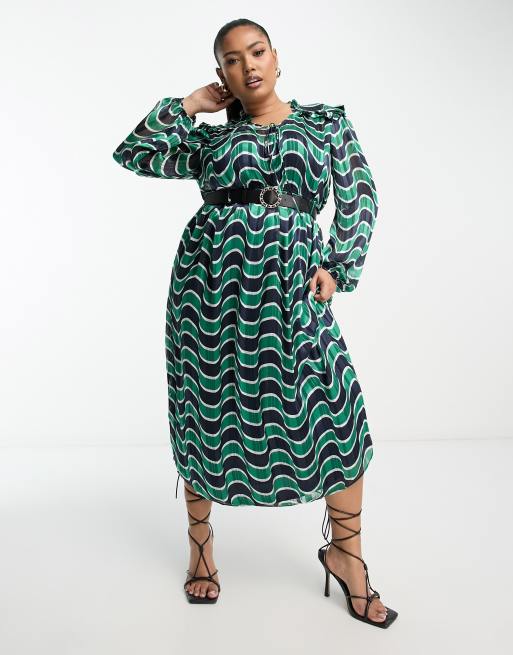 River Island Plus geo chiffon belted shirt midi dress in green