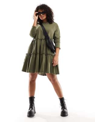 River Island plus long sleeved tiered smock dress in khaki