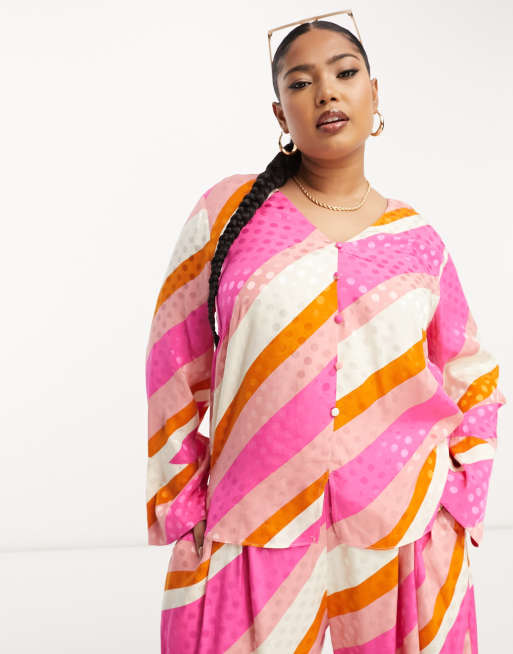River Island Plus v neck blouse in bright pink stripe