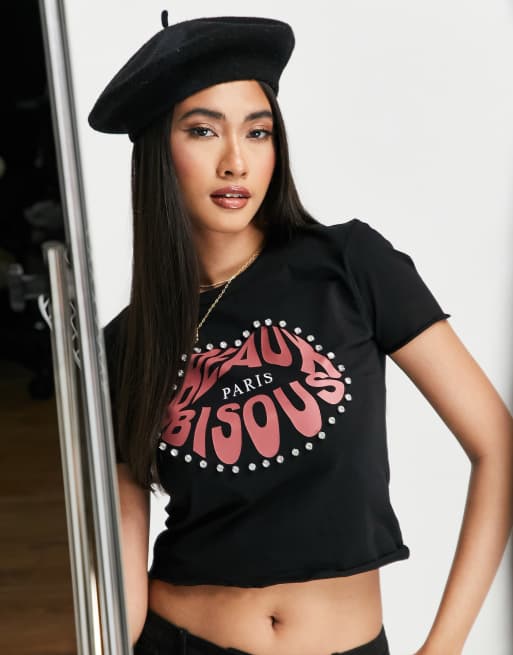 River Island 'Beaux Bisous' lips graphic cropped tee in black