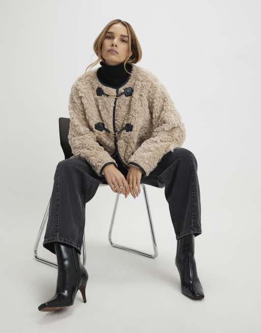 River Island Beige long sleeve tipped borg duffle coat in cream