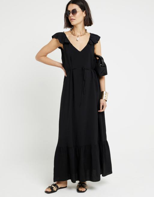 River Island Belted frill sleeve shift maxi dress in black