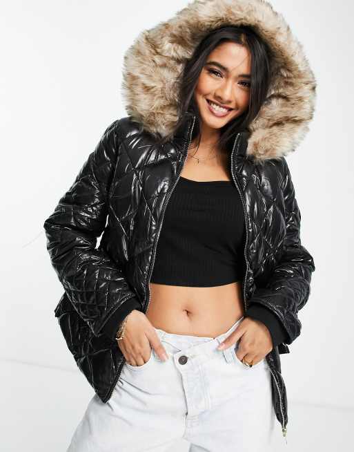 River Island belted patent quilted padded jacket with faux fur hood in black