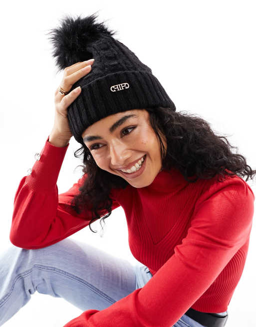 River Island cable knit pom beanie in black