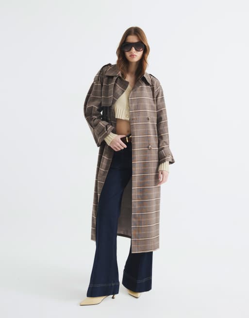 River Island Check belted trench coat in brown