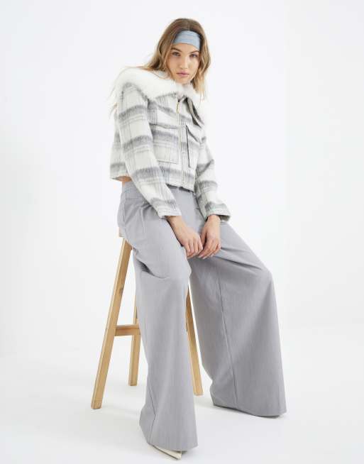 River Island Check faux fur collar crop jacket in grey - marl