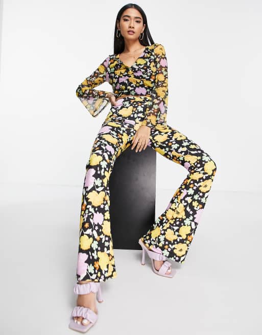 River Island co-ord ruched v front mesh floral flared trousers on yellow