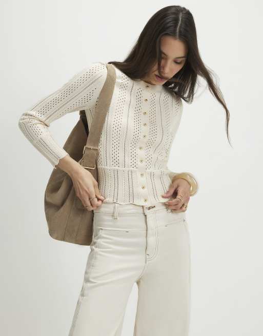 River Island Cream open knit long sleeve cardigan in stone