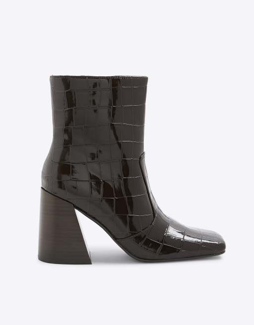 River Island Croc texture flared block heel boots in brown - dark