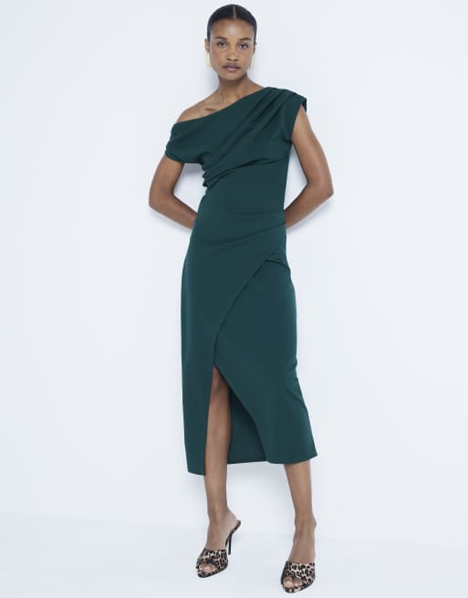 River Island Drape off shoulder bodycon midi dress in dark green