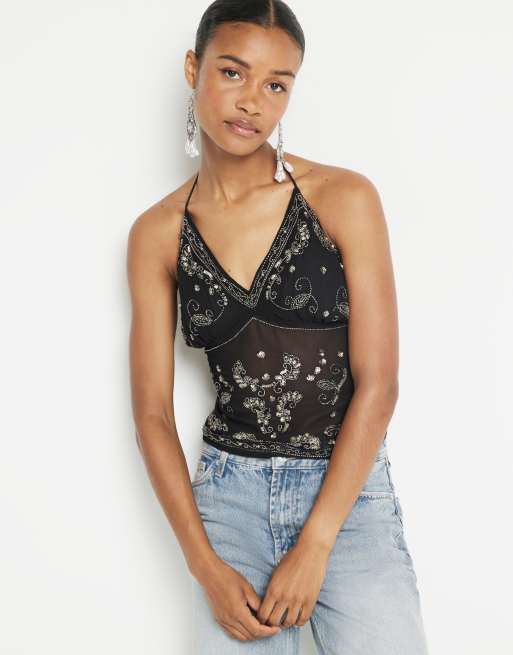 River Island embellished halterneck top in black