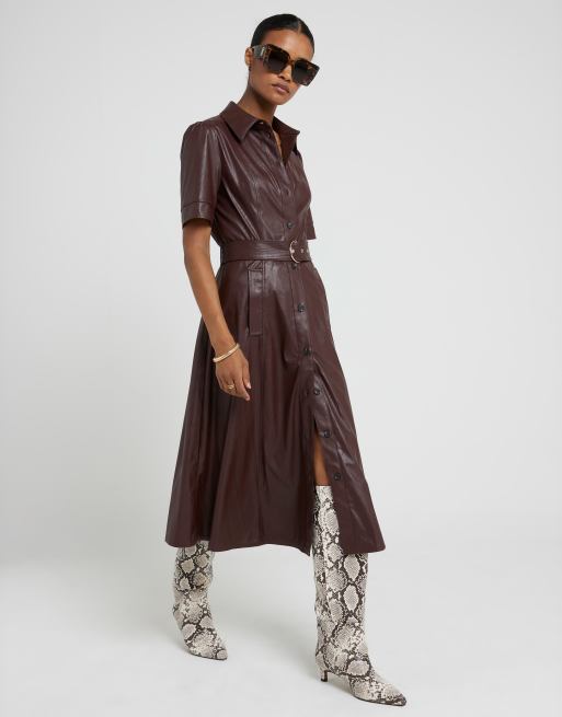 River Island Faux leather belted shirt midi dress in burgundy