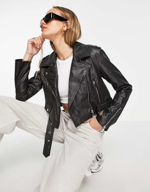River Island faux leather crop biker jacket in black