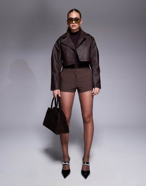 River Island faux leather crop jacket with balloon sleeves in dark brown