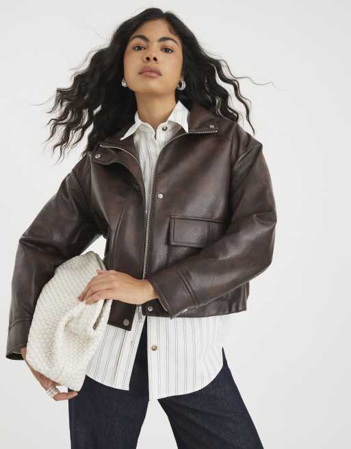 River Island Faux leather funnel neck bomber jacket in brown - dark