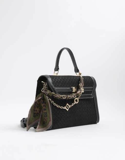 River Island Faux suede monogram charm tote bag in black
