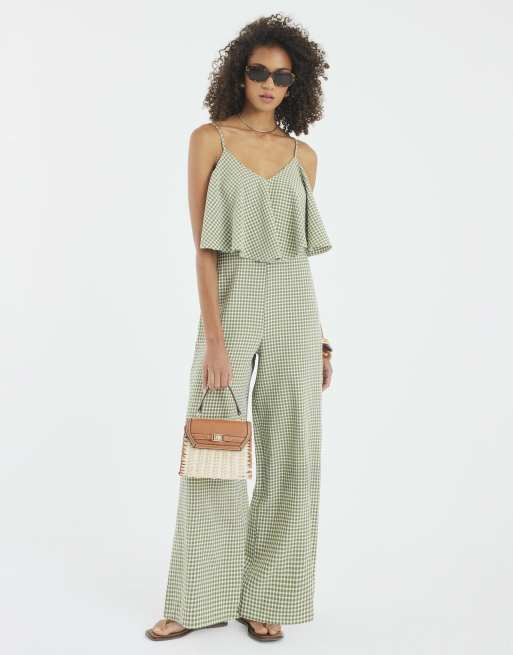 River Island Gingham double layer wide leg jumpsuit in khaki