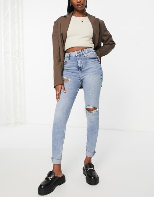 River Island high waisted ripped skinny sculpt jeans in medium blue
