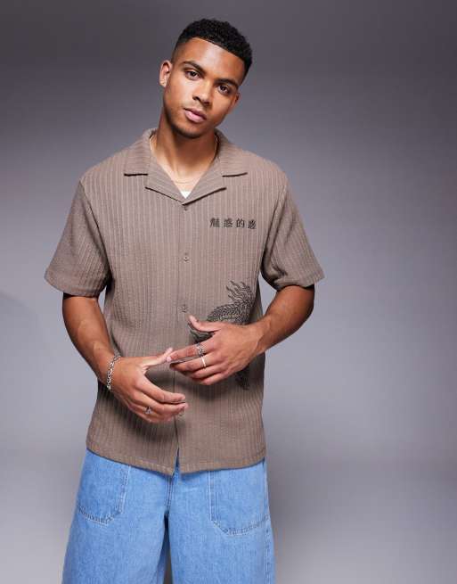 River Island Japanese dragon embroidered shirt in brown