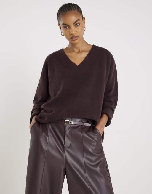 River Island Knitted v neck jumper in brown - dark