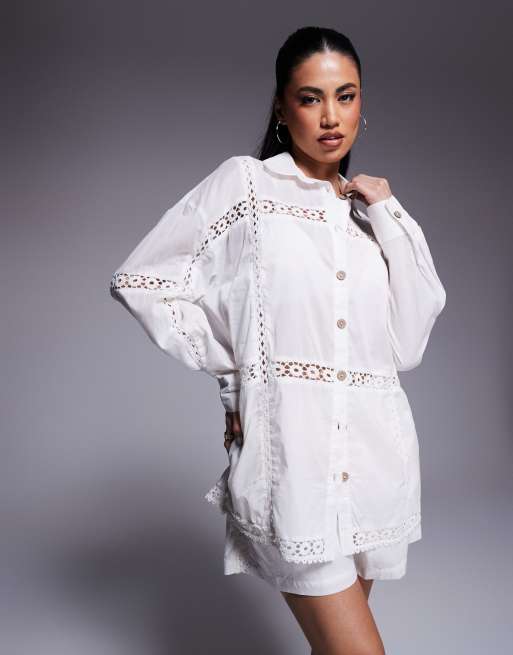 River Island lace insert shirt co-ord in white