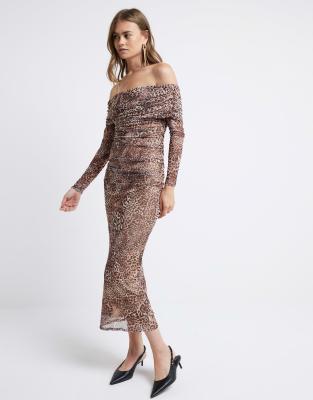 River Island Leopard print mesh bardot midi dress in brown - light