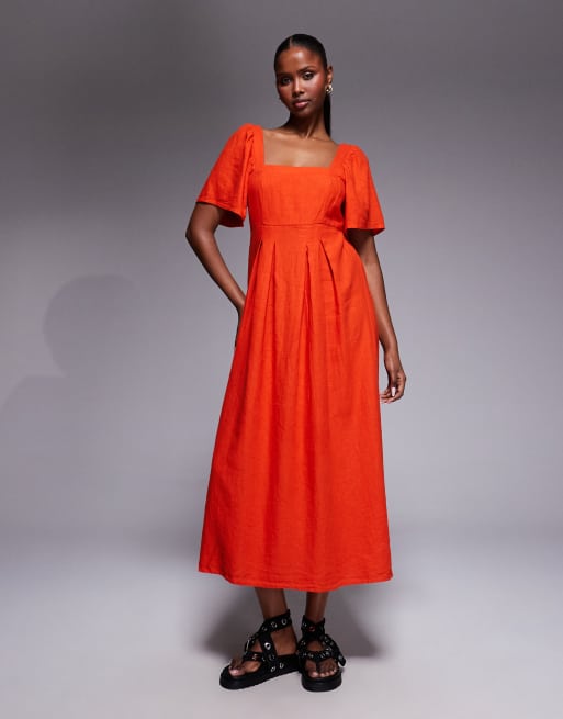 River Island linen look shirred midi dress in red