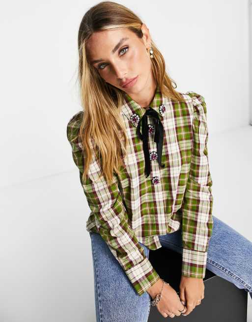 River Island long sleeve checked embroidered button shirt in green