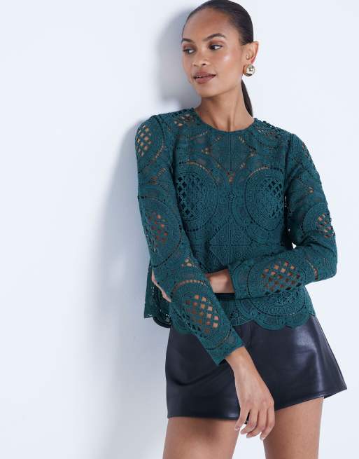 River Island Long sleeve lace t-shirt in green - dark