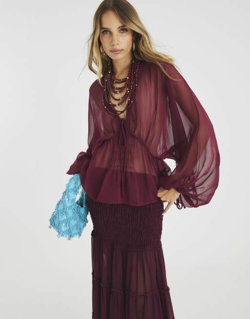 River Island Long sleeve smocked blouse in red - dark
