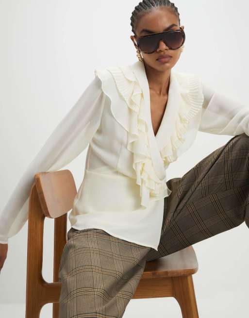 River Island Long sleeve wrap ruffle blouse in cream