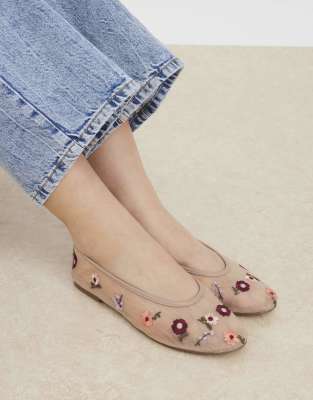 River Island Mesh floral embroidered ballet pumps in beige